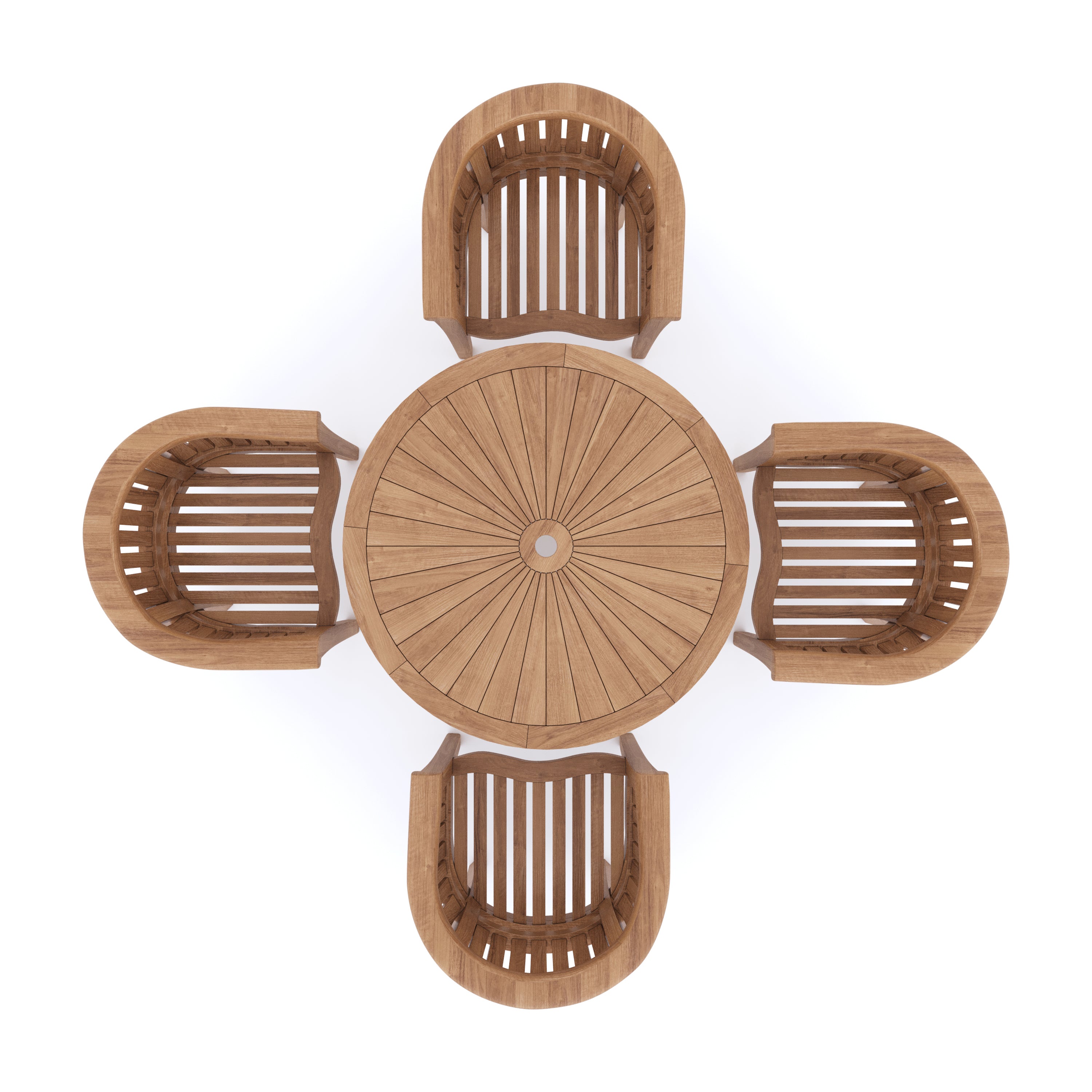 Bodo Teak Set 120cm Round Folding Sunshine Table, 4cm Top (4 teak San Francisco Chairs) Cushions included.